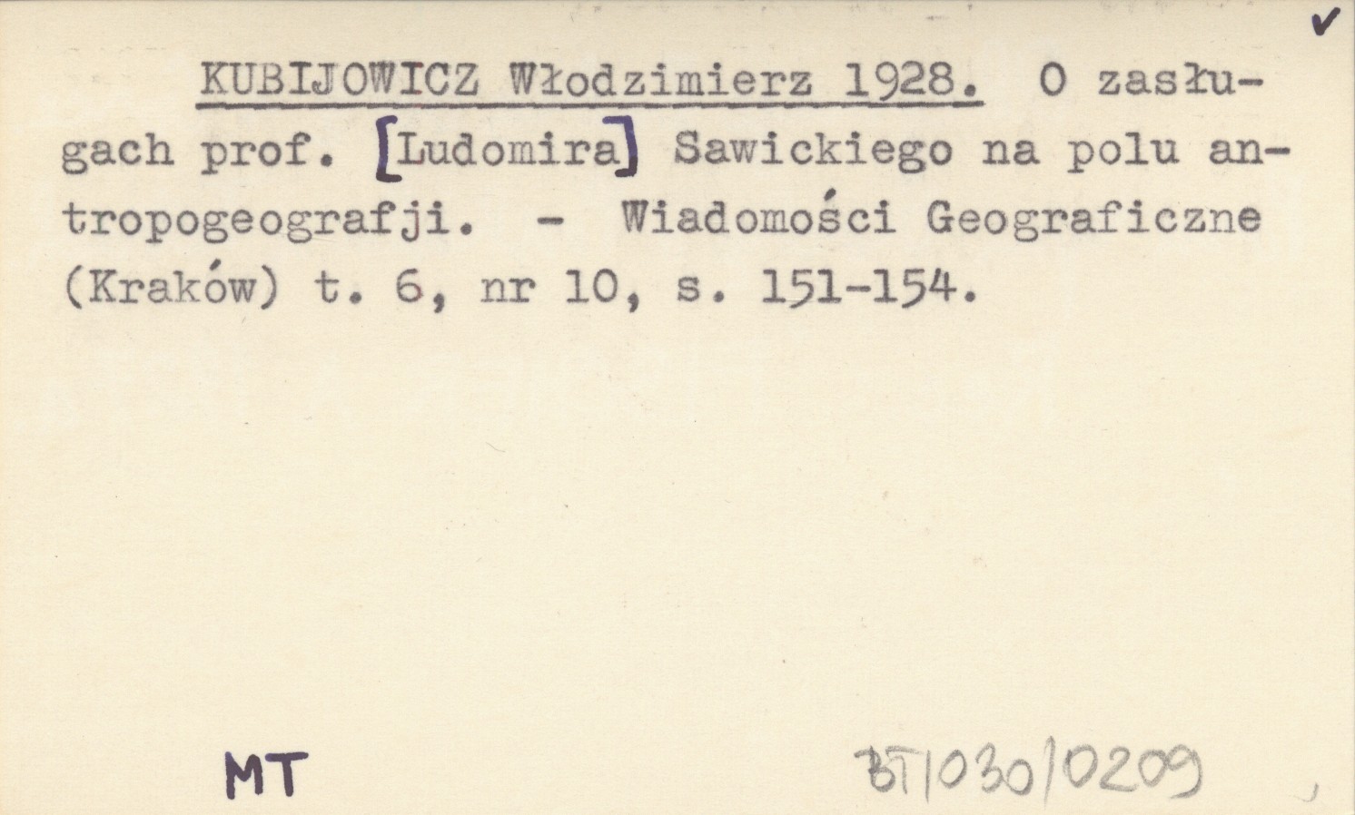 KUBIJOWICZ Włodzimierz 1928 O zasługach prof. [Ludomira] Sawickiego na polu antropogeografji.