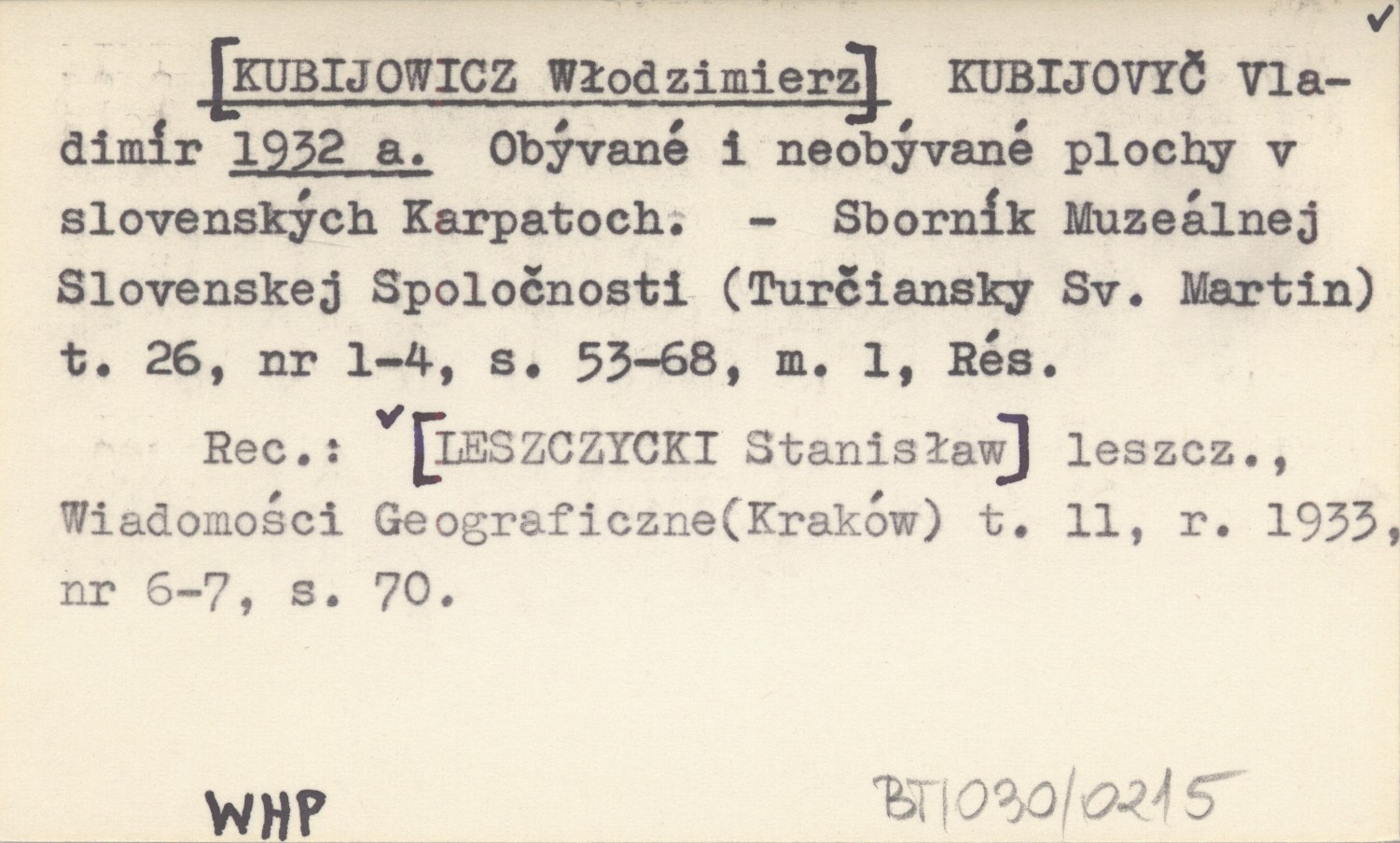 KUBIJOVYÈ Vladimír [KUBIJOWICZ Włodzimierz] 1932 a Obęvané i neobęvané plochy v slovenskęch Karpatoch.