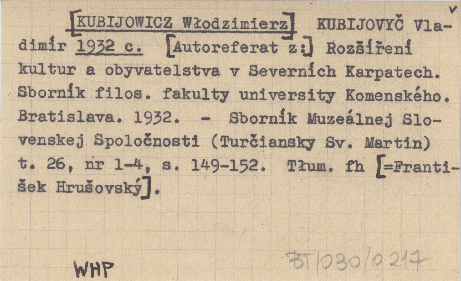 KUBIJOVYČ Vladimír [KUBIJOWICZ Włodzimierz] 1932 c [Autoreferat z:] Roząíření kultur a obyvatelstva v Severních Karpatech. Sborník Filosofické Fakulty Univerzity Komenského. Bratislava 1932.
