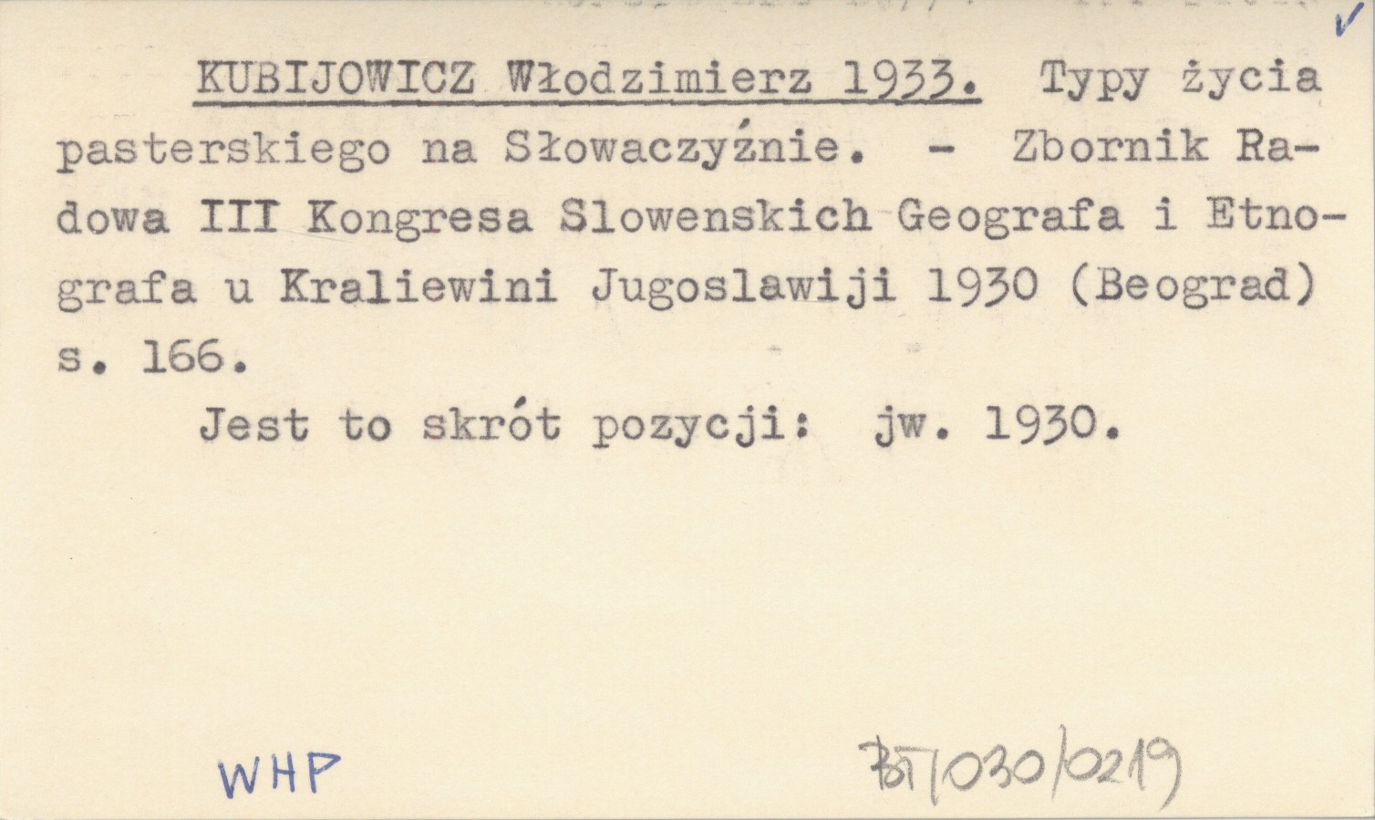Zbornik Radowa III Kongresa Slowenskich Geografa i Etnografa u Kraliewini Jugoslawiji 1930 (Beograd) , S. 166. Jest to skrót pozycji: jw. 1930.