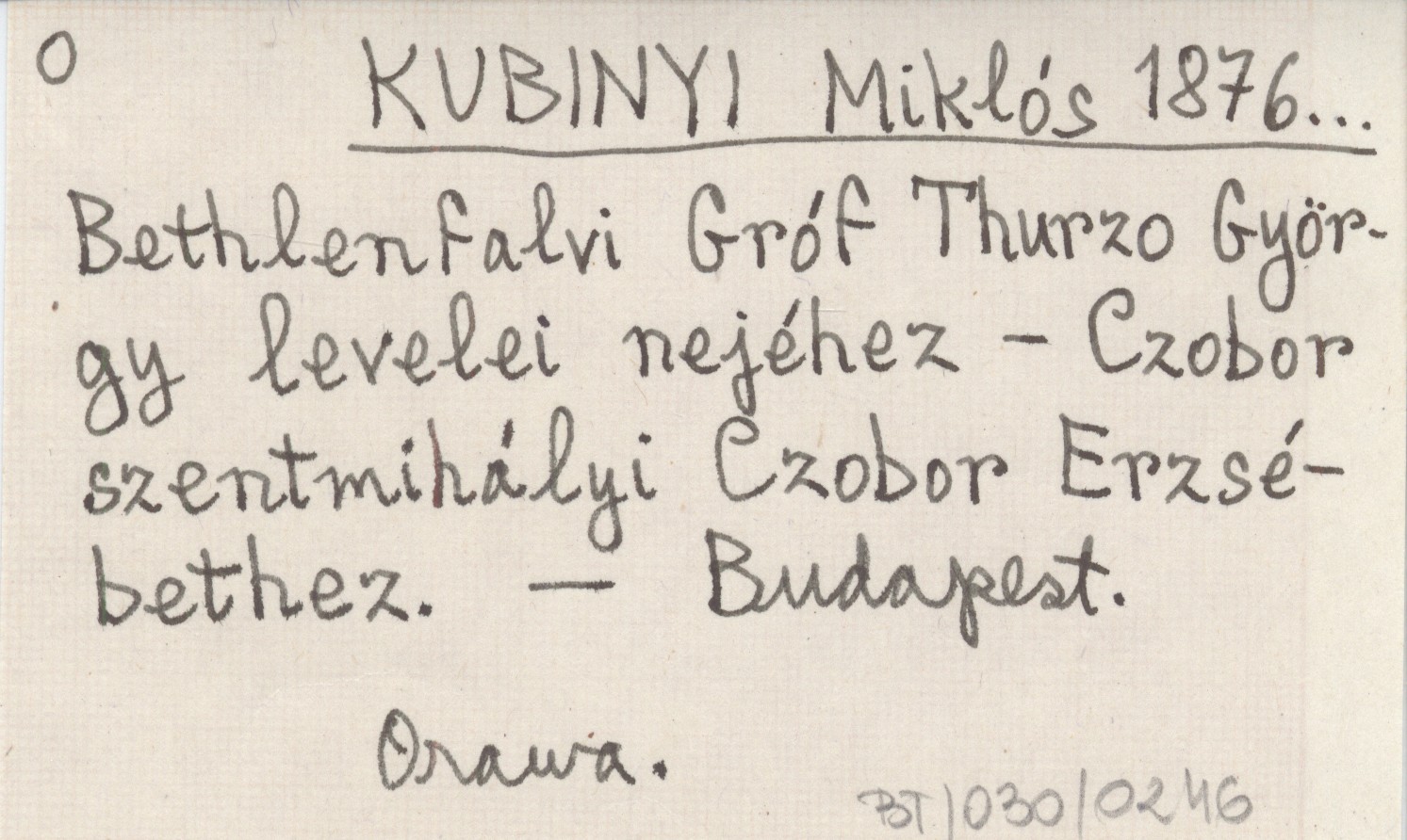 KUBINYI Miklós 1876... Bethlenfalvi Gróf Thurzo György levelei nejéhez - Czobor szentmihályi Czobor Erzsébethez.
