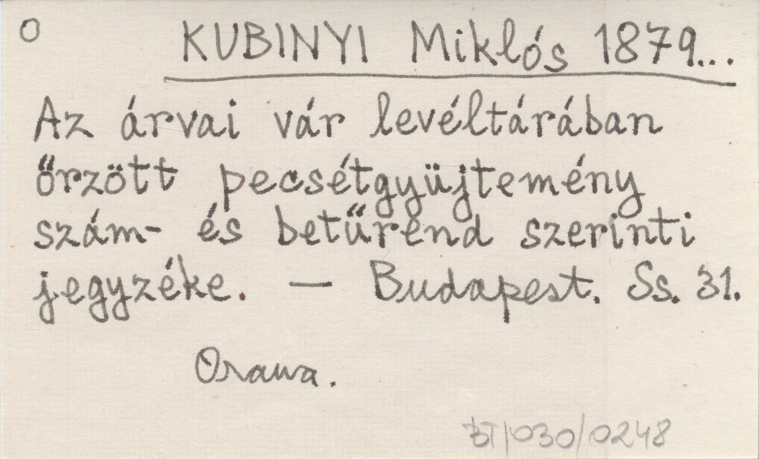 KUBINYI Miklós 1879... Az árvai vár levéltárában őrzött pecsétgyüjtemény szám- és betürend szerinti jegyzéke.