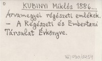 KUBINYI Miklós 1886... Árvamegyei régészeti emlékek.