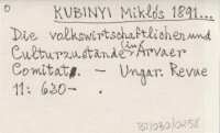 KUBINYI Miklós 1891... Die volkswirtschaftlichenund Culturzustände im Árvaer Comitat.