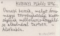 KUBINYI Miklós 1896... Ünnepi beszéd, melyet Árvamegye törvényhatósági bizottságának millenaris-közgyülése alkalmával tartott.