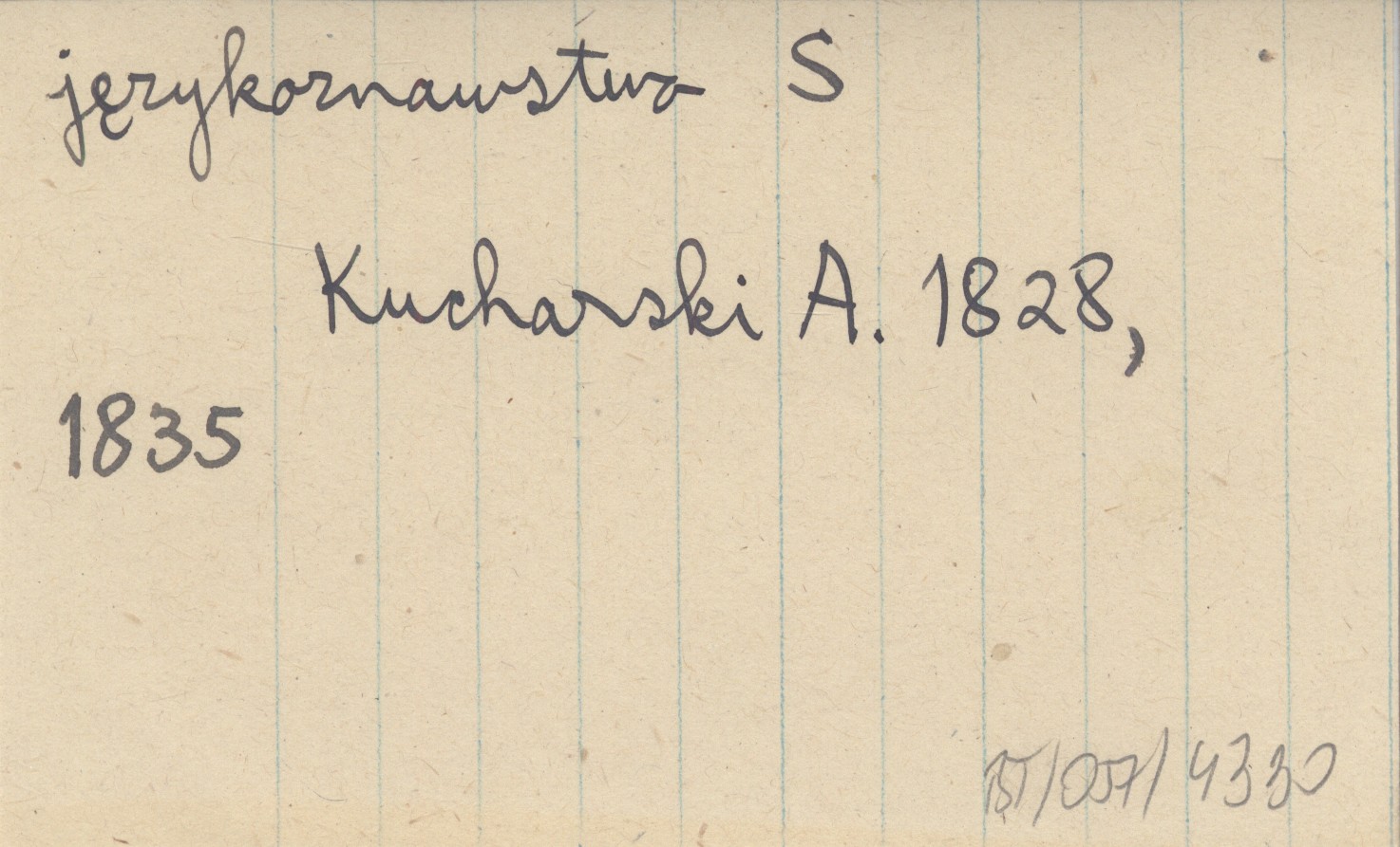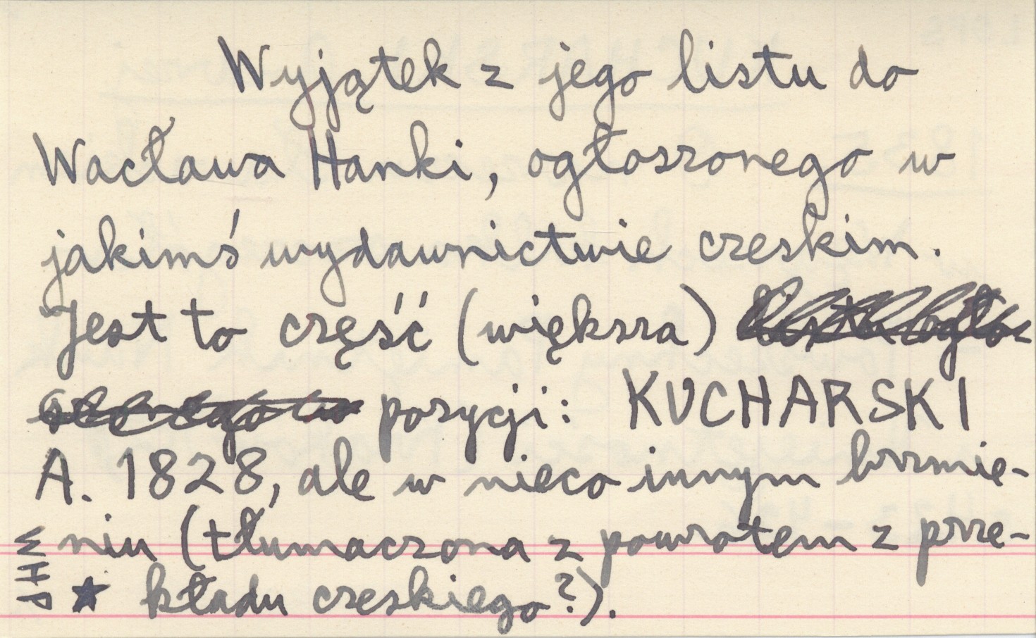 Powszechny Pamiętnik Nauk i Umiejętności (Kraków) , T. 2: 423-426. Wyjątek z jego listu do Wacława Hanki, ogłoszonego w jakimś wydawnictwie czeskim. Jest to część (większa) pozycji: KUCHARSKI A. 1828, ale w nieco innym brzmieniu (tłumaczona z powrotem z przekładu czeskiego?).