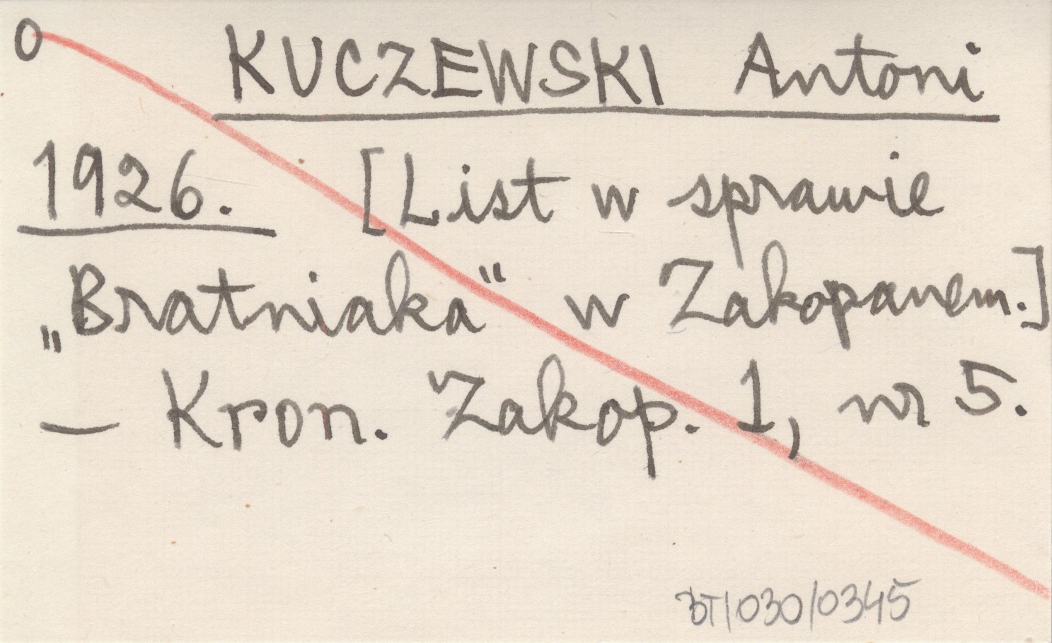 KUCZEWSKI Antoni 1926 [List w sprawie "Bratniaka" w Zakopanem.]