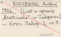 KUCZEWSKI Antoni 1926 [List w sprawie "Bratniaka" w Zakopanem.]