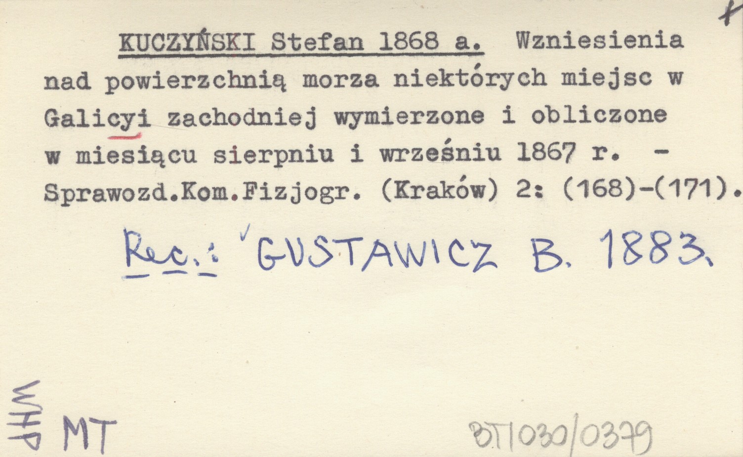 KUCZYŃSKI Stefan 1868 a Wzniesienia nad powierzchnią morza niektórych miejsc w Galicyi zachodniej wymierzone i obliczone w miesiącu sierpniu i wrześniu 1867 r.