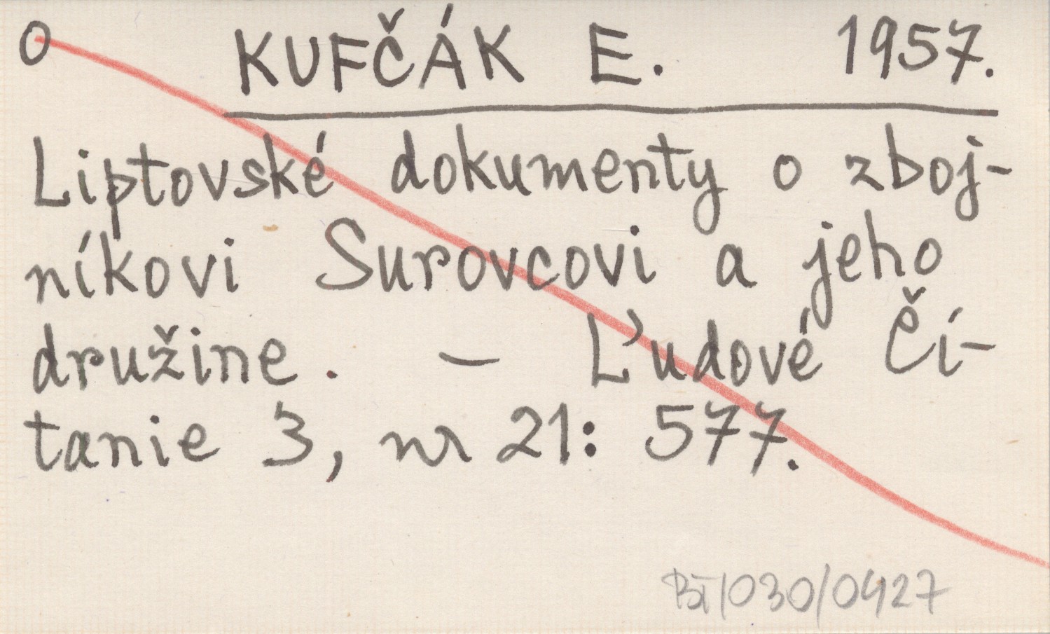 KUFČÁK E. 1957 Liptovské dokumenty o zbojníkovi Surovcovi a jeho družine.