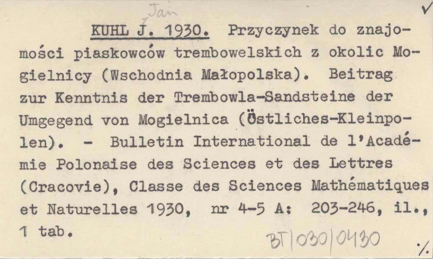 KUHL Jan 1930 Przyczynek do znajomości piaskowców trembowelskich z okolic Mogielnicy (Wschodnia Małopolska). Beitrag zur Kenntnis der Trembowla-Sandsteine der Umgegend von Mogielnica (Östliches-Kleinpolen).
