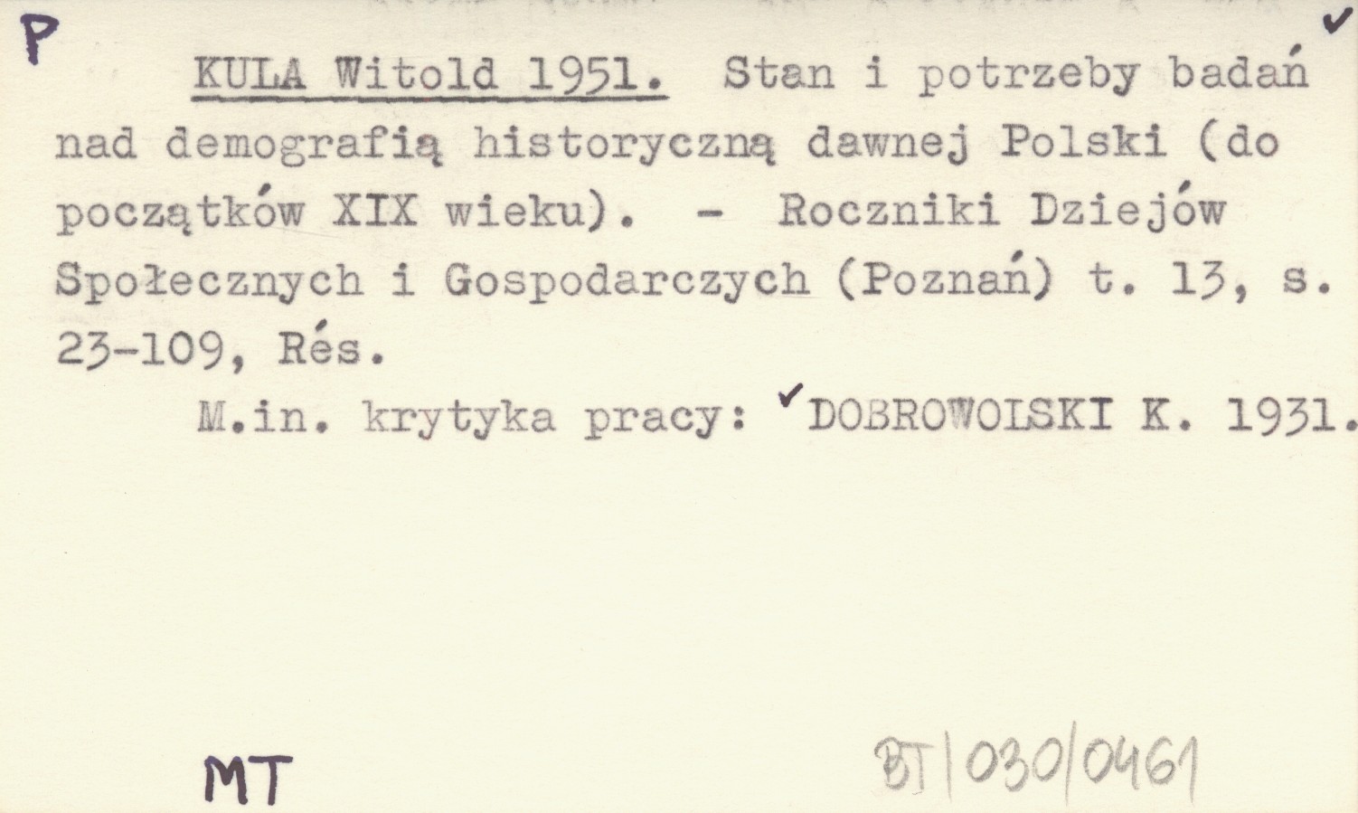 KULA Witold 1951 Stan i potrzeby badań nad demografją historyczną dawnej Polski (do początków XIX wieku).