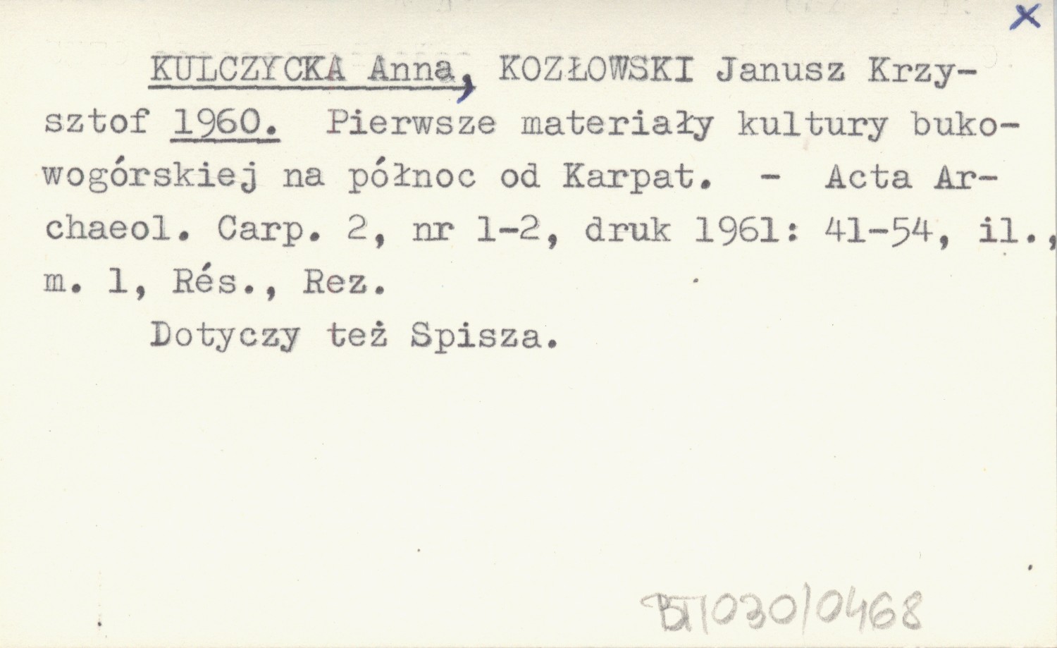 KULCZYCKA Anna KOZŁOWSKI, Janusz Krzysztof. ; 1960 Pierwsze materiały kultury bukowogórskiej na północ od Karpat.