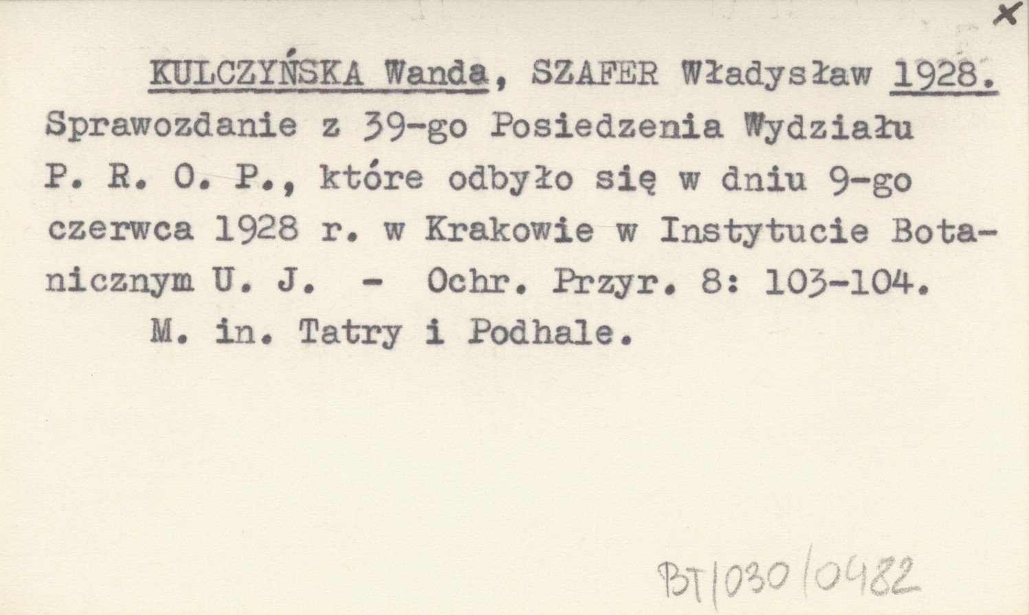 KULCZYŃSKA Wanda SZAFER, Władysław. ; 1928 Sprawozdanie z 39-go Posiedzenia Wydziału P.R.O.P., które odbyło się w dniu 9-go czerwca 1928 r. w Krakowie w Instytucie Botanicznym U.J.