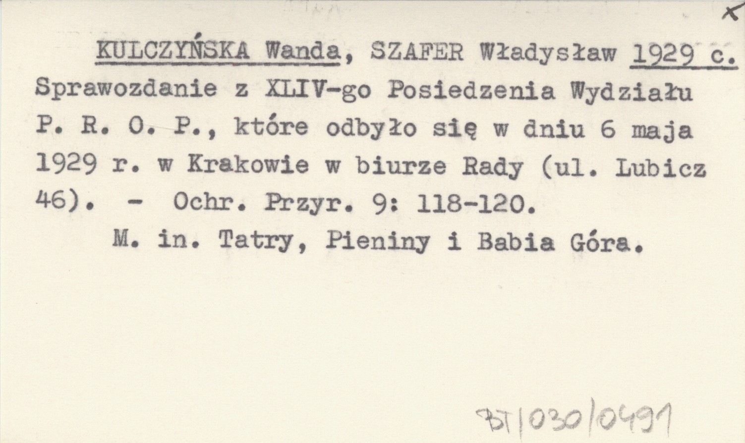 KULCZYŃSKA Wanda SZAFER, Władysław. ; 1929 c Sprawozdanie z XLIV-go Posiedzenia Wydziału P.R.O.P., które odbyło się w dniu 6 maja 1929 r. w Krakowie w biurze Rady (ul. Lubicz 46).