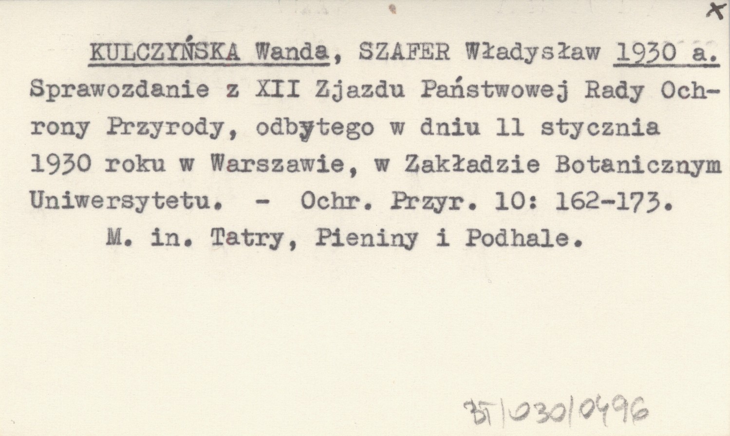 KULCZYŃSKA Wanda SZAFER, Władysław. ; 1930 a Sprawozdanie z XII Zjazdu Państwowej Rady Ochrony Przyrody, odbytego w dniu 11 stycznia 1930 roku w Warszawie, w Zakładzie Botanicznym Uniwersytetu.