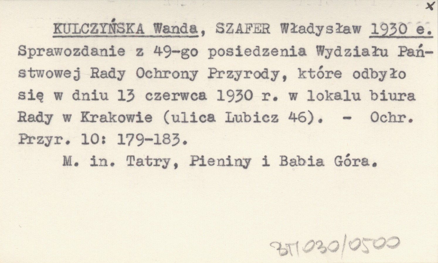 KULCZYŃSKA Wanda SZAFER, Władysław. ; 1930 e Sprawozdanie z 49-go posiedzenia Wydziału Państwowej Rady Ochrony Przyrody, które odbyło się w dniu 13 czerwca 1930 r. w lokalu biura Rady w Krakowie (ulica Lubicz 46).