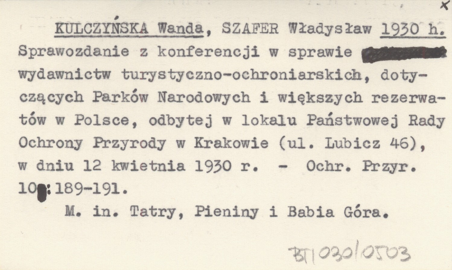 KULCZYŃSKA Wanda SZAFER, Władysław. ; 1930 h Sprawozdanie z konferencji w sprawie wydawnictw turystyczno-ochroniarskich, dotyczących Parków Narodowych i większych rezerwatów w Polsce, odbytej w lokalu Państwowej Rady Ochrony Przyrody w Krakowie (ul. Lubicz 46), w dniu 12 kwietnia 1930 r.