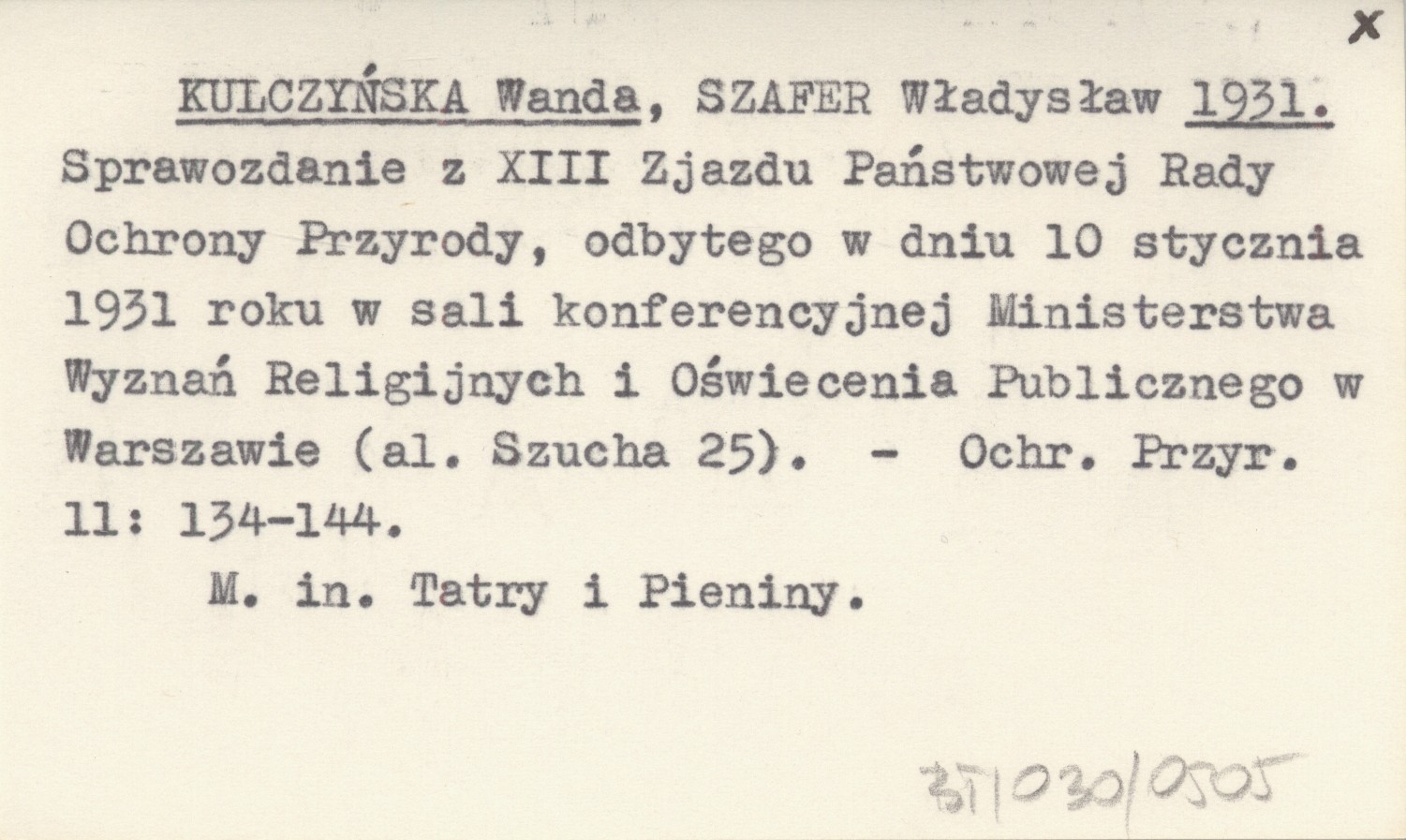 KULCZYŃSKA Wanda SZAFER, Władysław. ; 1931 Sprawozdanie z XIII Zjazdu Państwowej Rady Ochrony Przyrody, odbytego w dniu 10 stycznia 1931 roku w sali konferencyjnej Ministerstwa Wyznań Religijnych i Oświecenia Publicznego w Warszawie (al. Szucha 25).