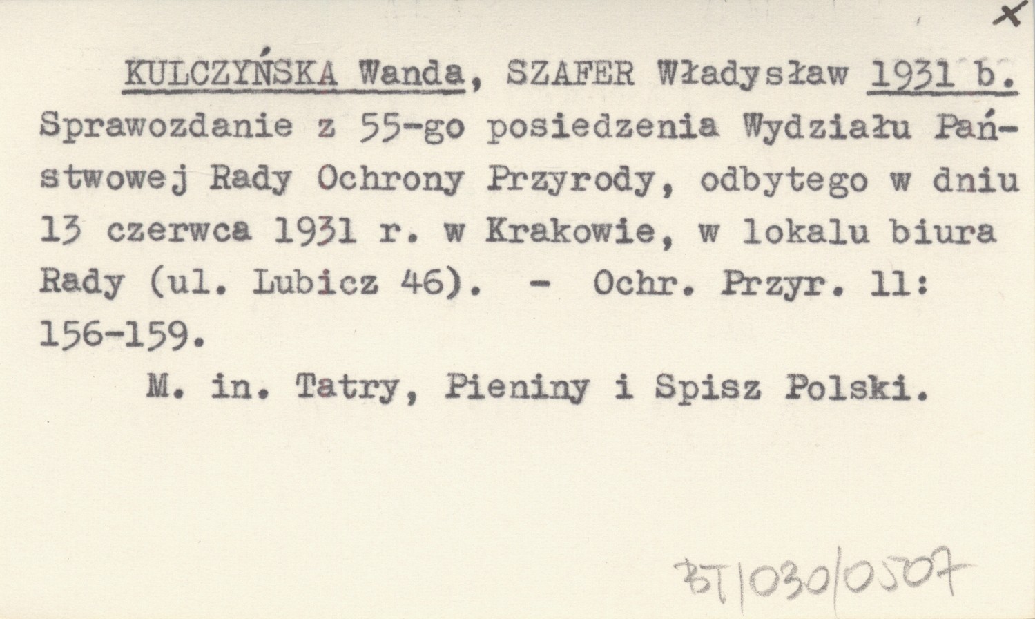 KULCZYŃSKA Wanda SZAFER, Władysław. ; 1931 b Sprawozdanie z 55-go posiedzenia Wydziału Państwowej Rady Ochrony Przyrody, odbytego w dniu 13 czerwca 1931 r. w Krakowie, w lokalu biura Rady (ul. Lubicz 46).