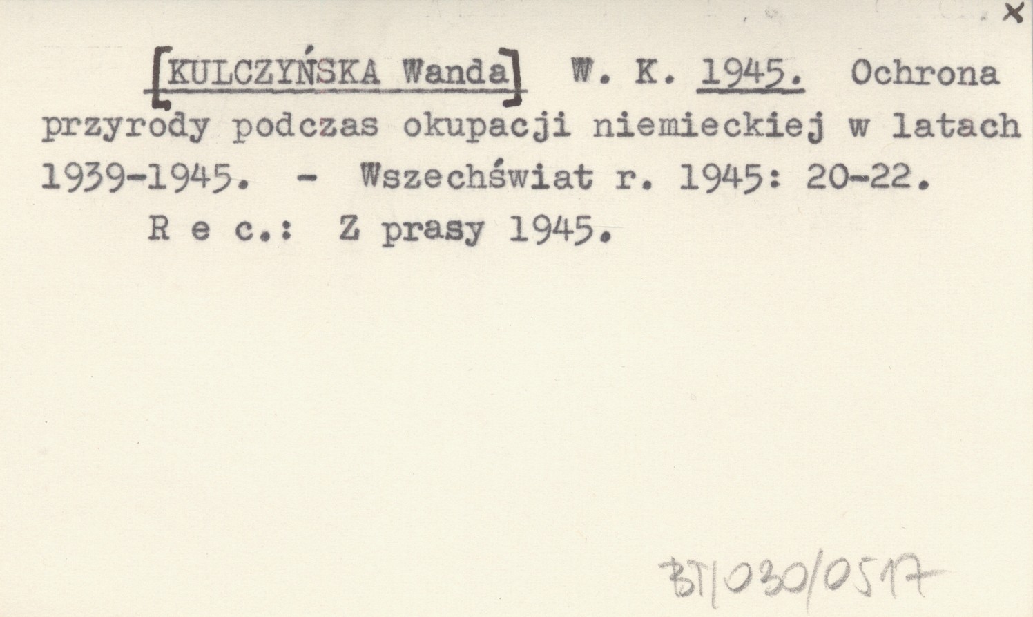 W. K. [KULCZYŃSKA Wanda] 1945 Ochrona przyrody podczas okupacji niemieckiej w latach 1939-1945.