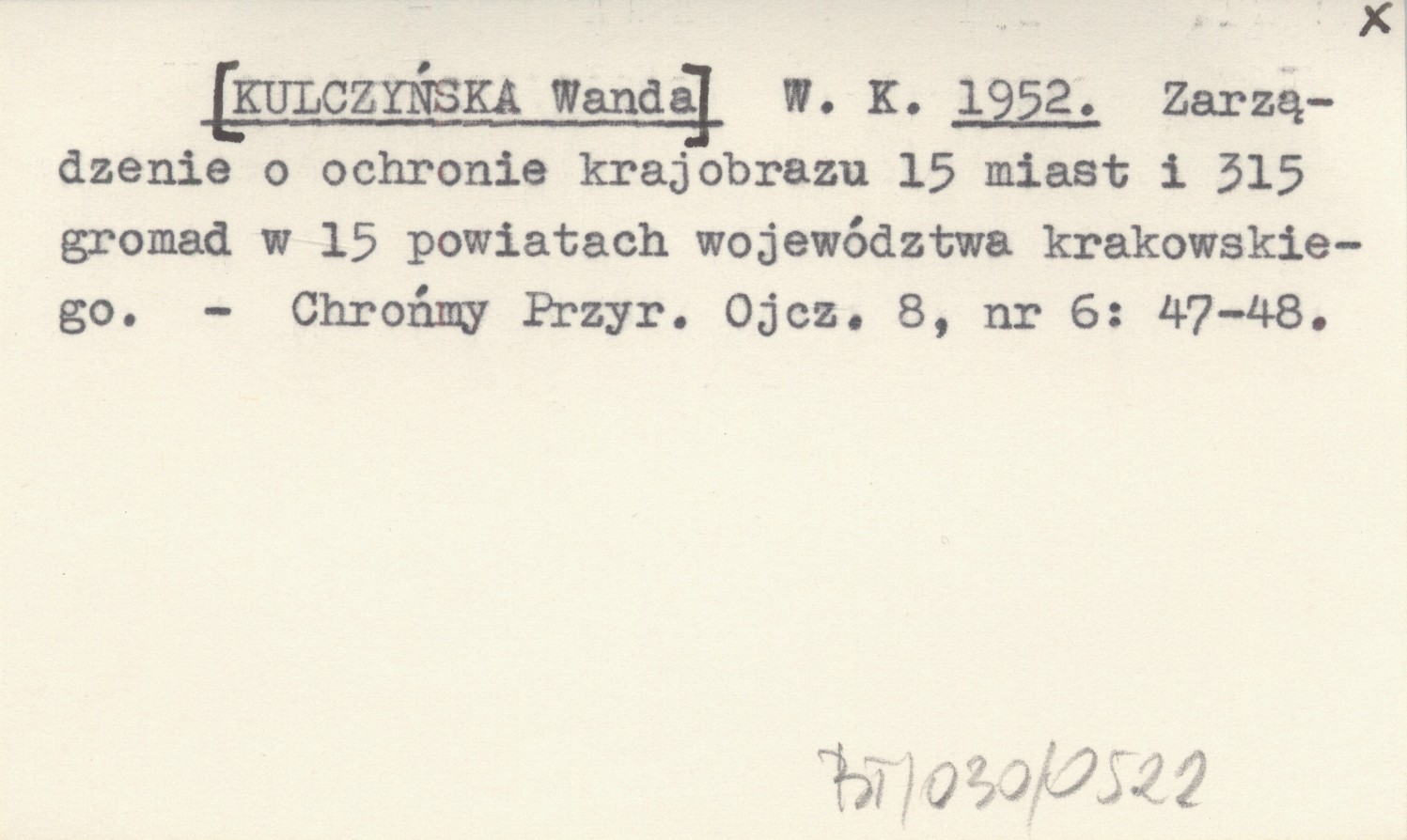 W. K. [KULCZYŃSKA Wanda] 1952 Zarządzenie o ochronie krajobrazu 15 miast i 315 gromad w 15 powiatach województwa krakowskiego.