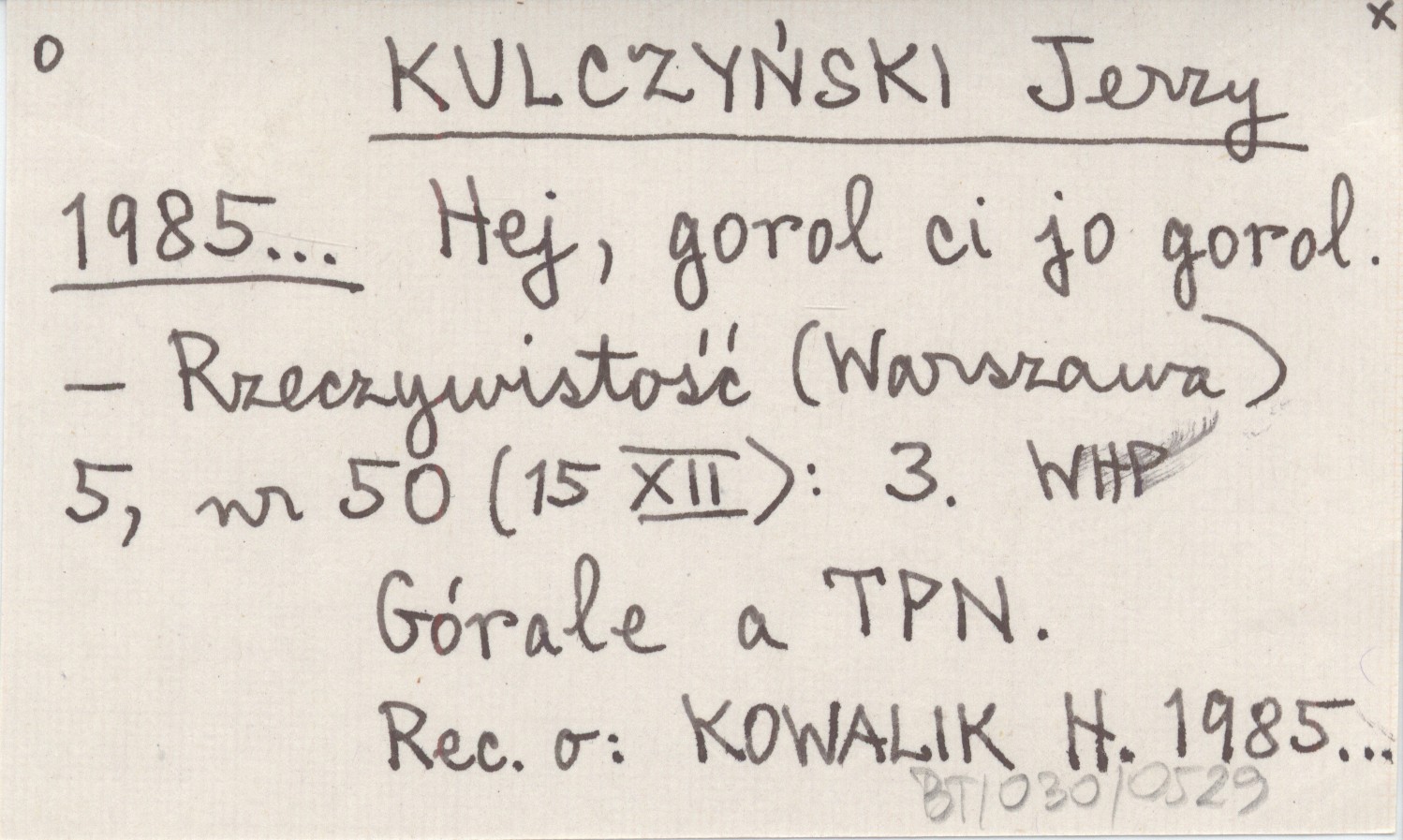 Rzeczywistość (Warszawa) , 5, nr 50 (15 XII): 3. Górale a TPN. Recenzja o: KOWALIK H. 1985...