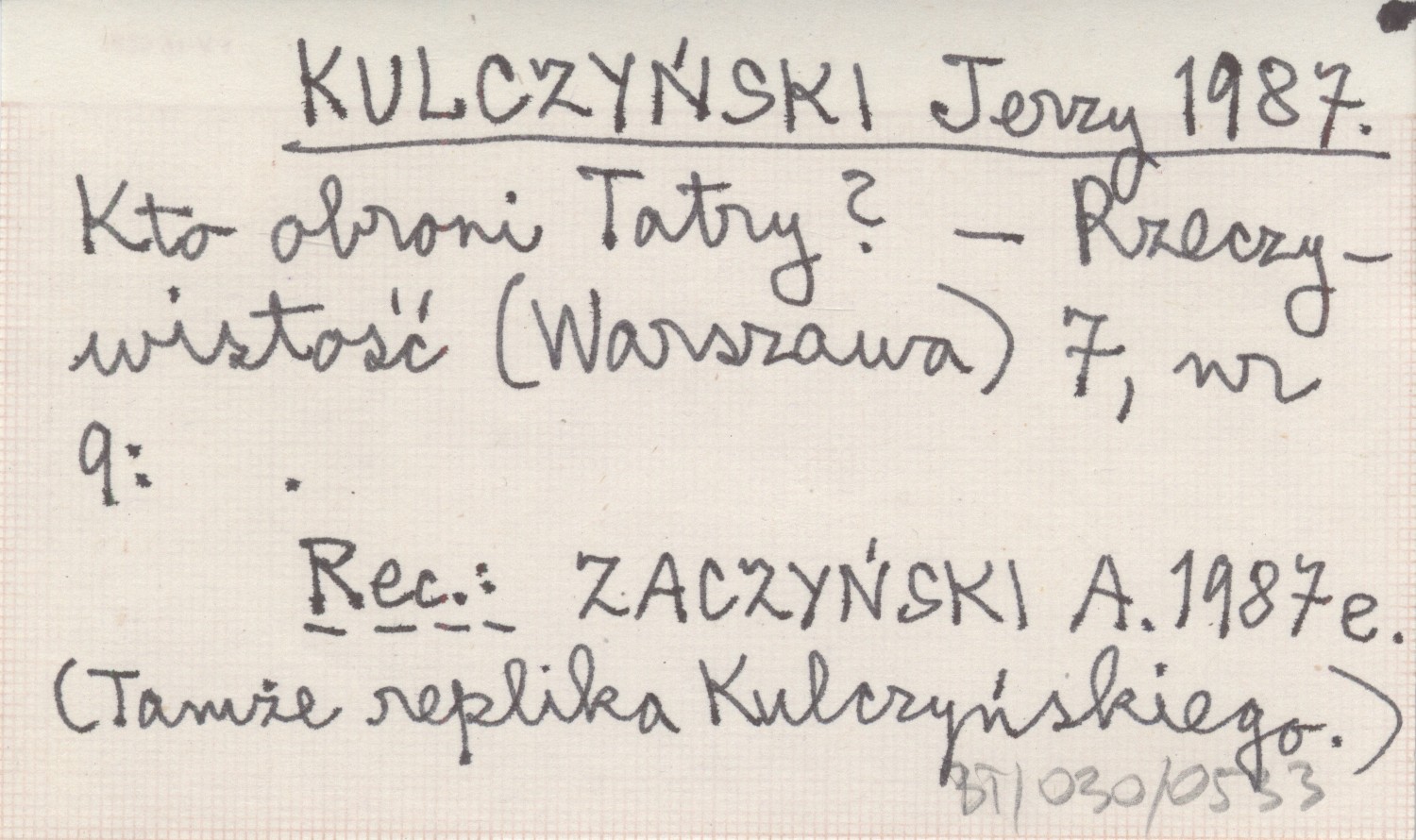 Rzeczywistość (Warszawa) , 7, nr 9. REC: ZACZYŃSKI A. 1987 e (tamże replika Kulczyńskiego)