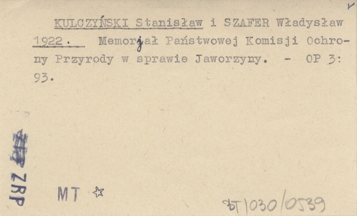 KULCZYŃSKI Stanisław SZAFER, Władysław. ; 1922 Memorjał Państwowej Komisji Ochrony Przyrody w sprawie Jaworzyny.
