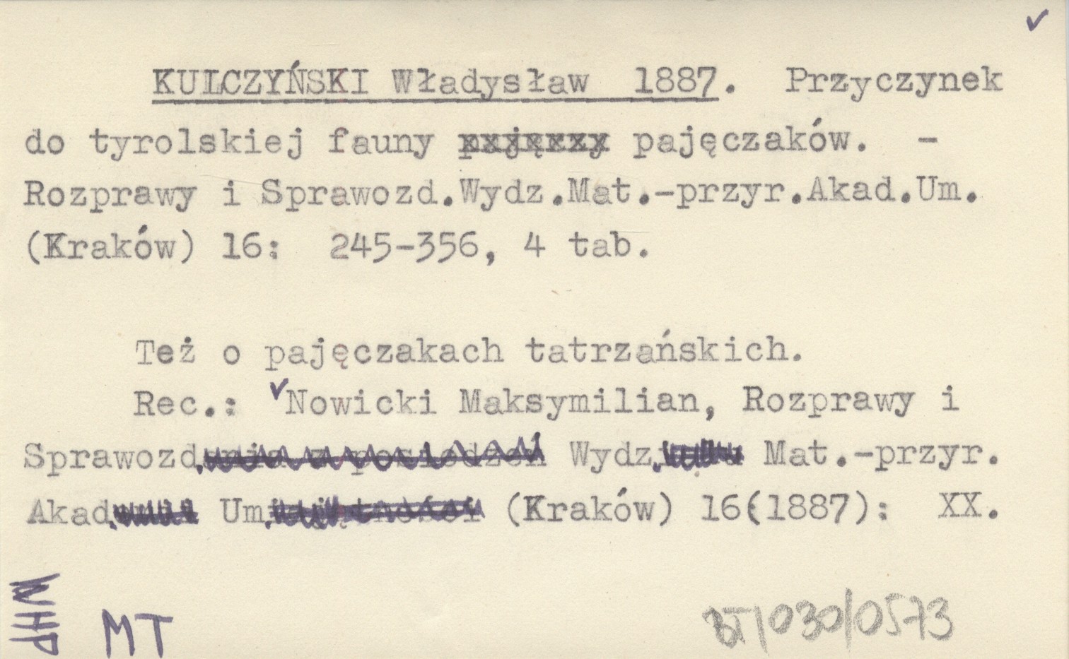 KULCZYŃSKI Władysław 1887 Przyczynek do tyrolskiej fauny pajęczaków.