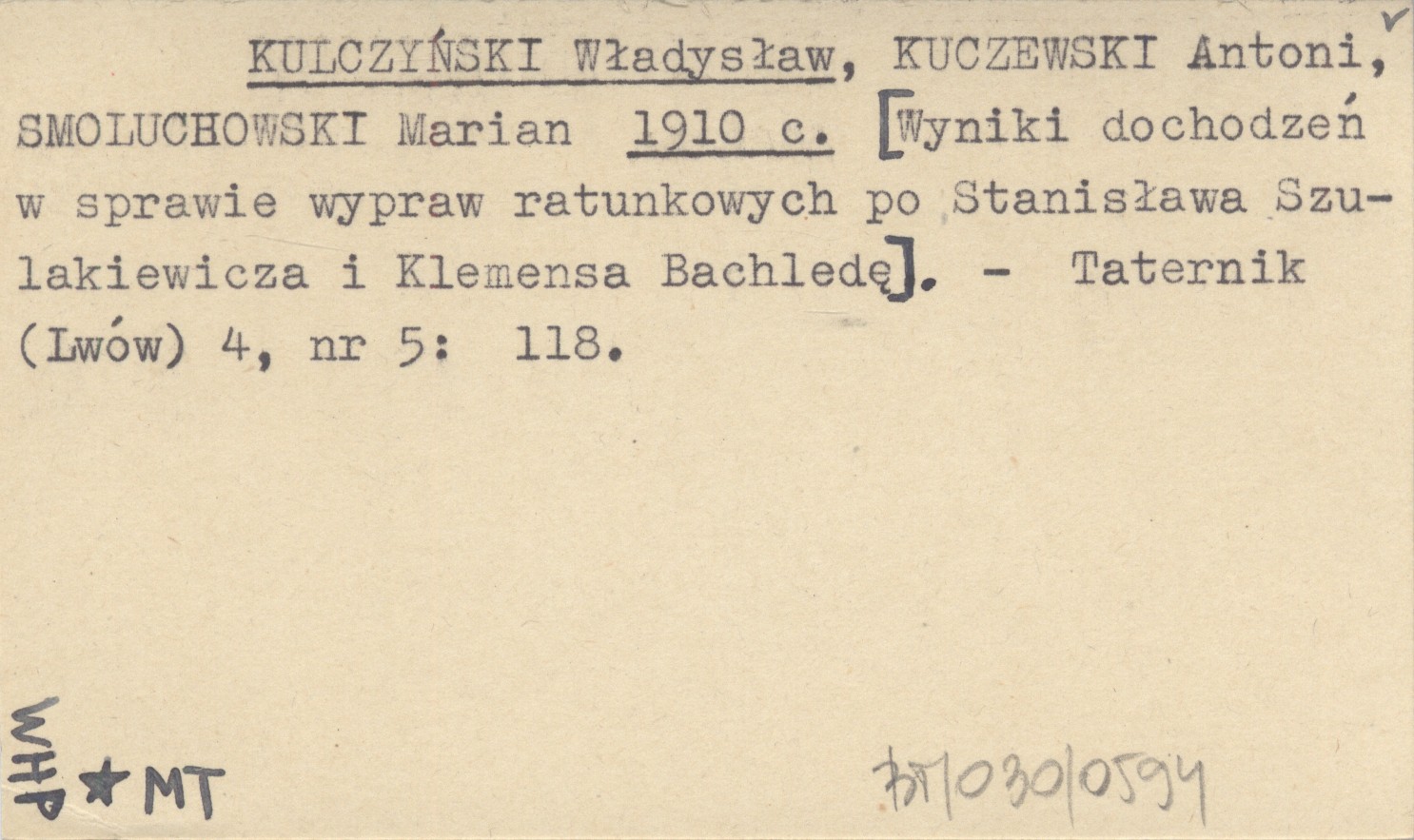 KULCZYŃSKI Władysław KUCZEWSKI, Antoni. ; SMOLUCHOWSKI, Marian. ; 1910 c [Wyniki dochodzeń w sprawie wypraw ratunkowych po Stanisława Szulakiewicza i Klemensa Bachledę.]