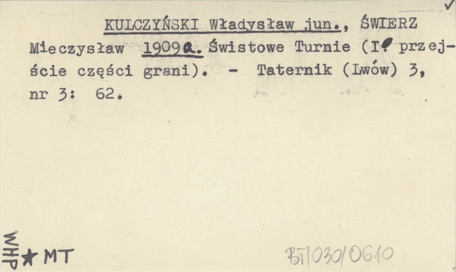 KULCZYŃSKI Władysław jun. ŚWIERZ, Mieczysław. ; 1909 a Świstowe Turnie (I. przejście części grani).