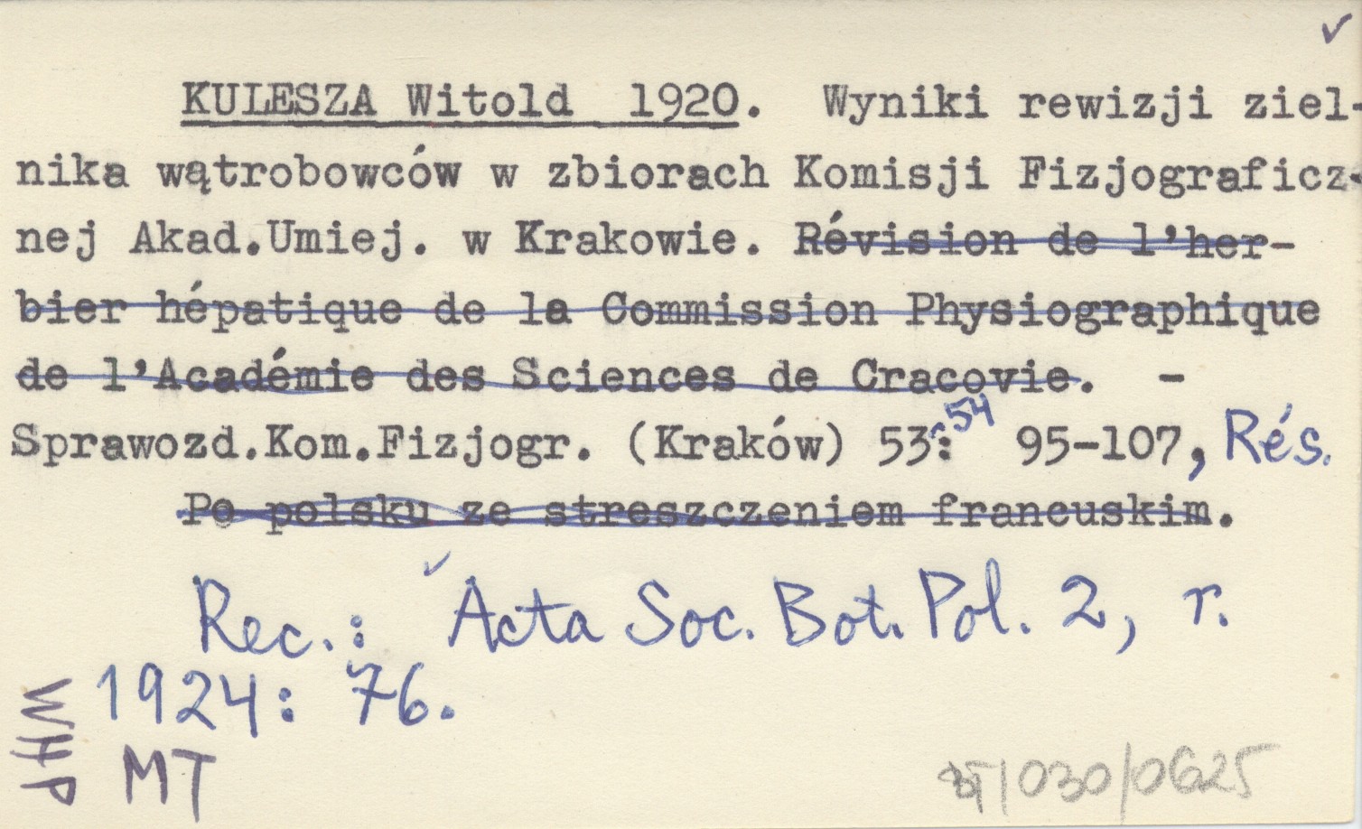 KULESZA Witold 1920 Wyniki rewizji zielnika wątrobowców w zbiorach Komisji Fizjograficznej Akad. Umiej. w Krakowie.