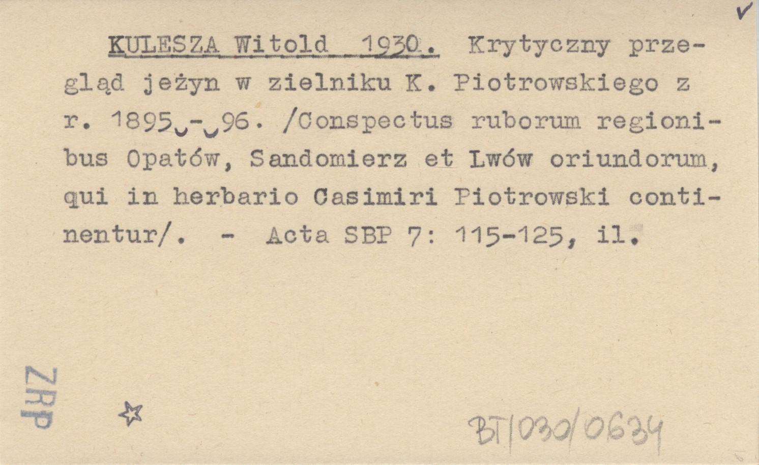 KULESZA Witold 1930 Krytyczny przegląd jeżyn w zielniku K. Piotrowskiego z r. 1895-96. (Conspectus ruborum regionibus Opatów, Sandomierz et Lwów oriundorum, qui in herbario Casimiri Piotrowski continentur).