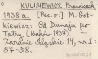 KULISIEWICZ Franciszek 1938 a [Rec. o:] M. Gotkiewicz: Od Dunaju po Tatry (Kraków 1937).