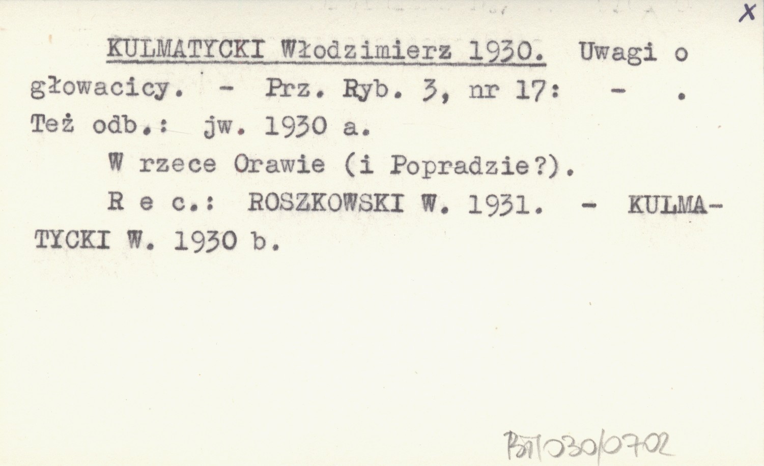 Przegląd Rybacki, 3, nr 17. W rzece Orawie (i Podgrodzie?). Też odb.: jw. 1930 a REC: ROSZKOWSKI W. 1931 ; KULMATYCKI W. 1930 b ;