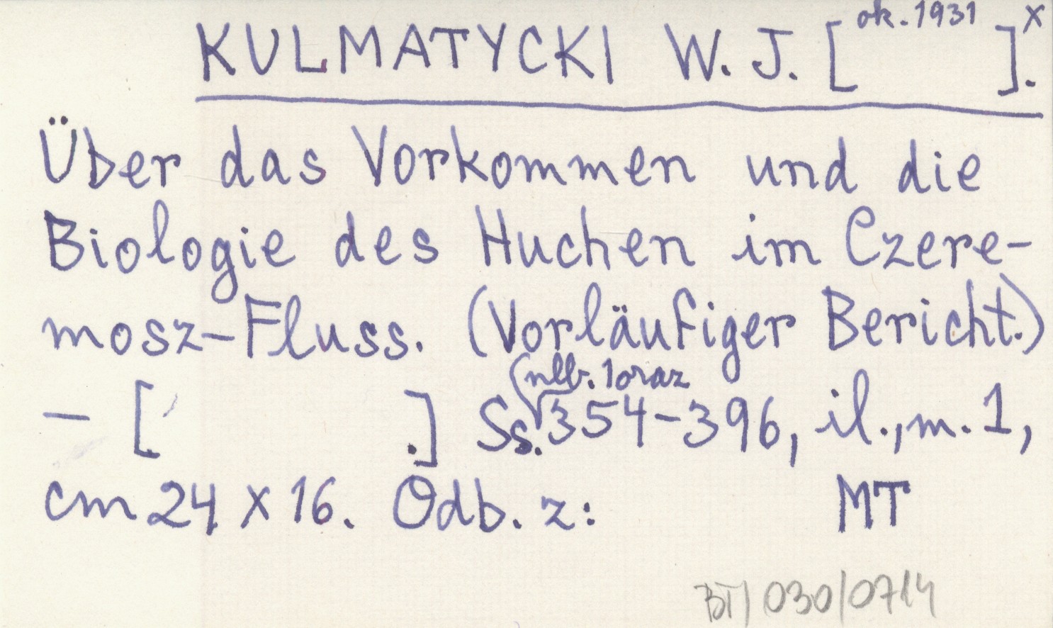 KULMATYCKI W. J. [ok. 1931] Über das Vorkommen und die Biologie des Huchen im Czeremosz-Fluss. (Vorläufiger Bericht).