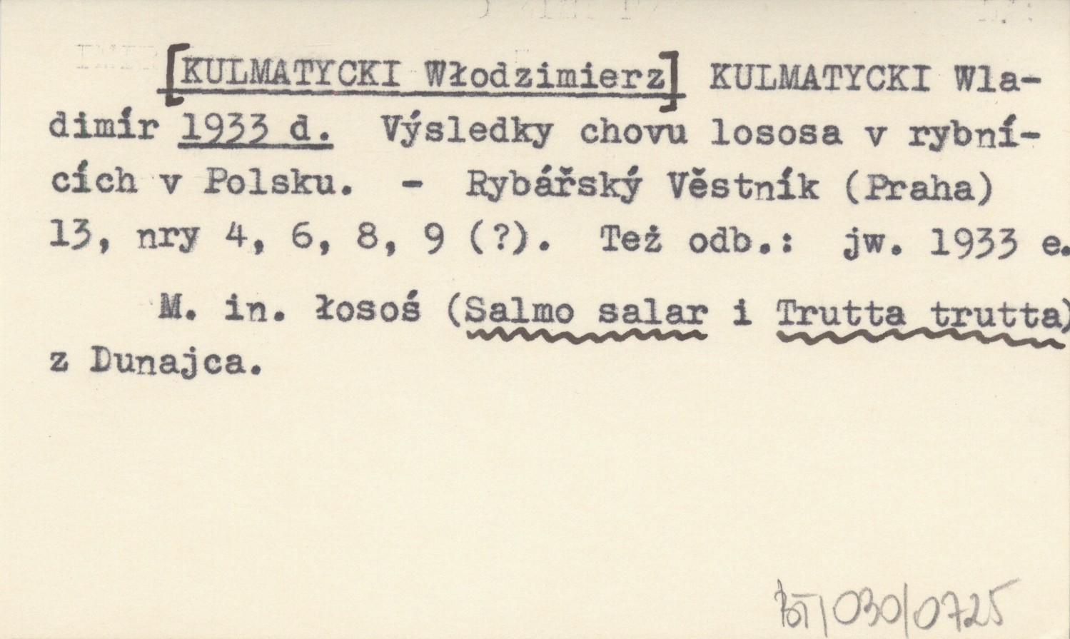 KULMATYCKI Wladimír [KULMATYCKI Włodzimierz] 1933 d Výsledky chovu lososa v rybnících v Polsku.
