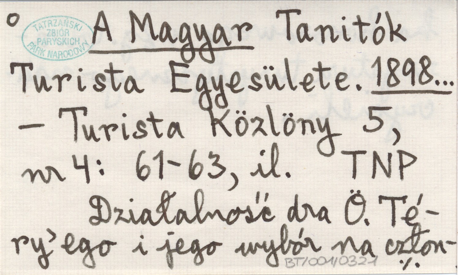 Turista Közlöny, 5, nr 4: 61-63, il. Działalność dra. Ö. Téry'ego i jego wybór na członka honorowego węg. towarzystwa turystycznego nauczycieli.