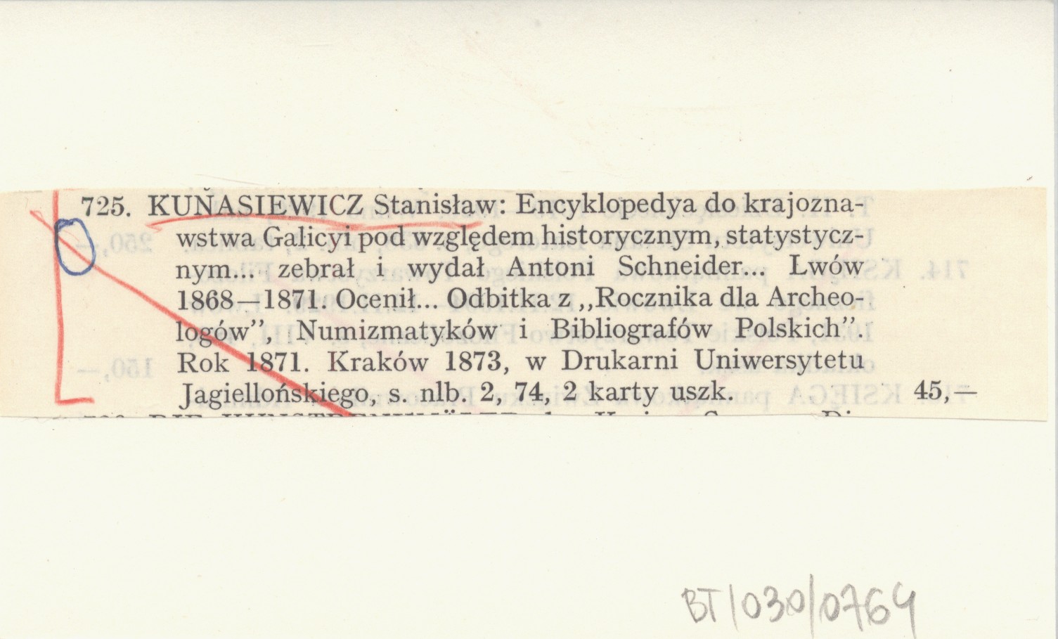KUNASIEWICZ Stanisław 1873 Encyklopedya do krajoznawstwa Galicyi pod względem historycznym, statystycznym ... zebrał i wydał Antoni Schneider... Lwów 1868-1871. Ocenił...