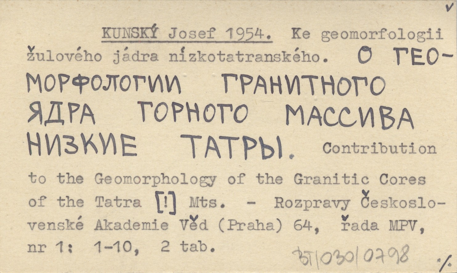 KUNSKÝ Josef 1954 Ke geomorfologii žulového jádra nízkotatranského. O geomorfologii granitnogo jadra gornogo massiva Nizkie Tatry. Contribution to the Geomorphology of the Granitic Cores of the Tatra [!] Mts.