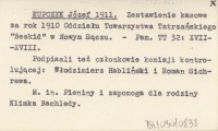 KUPCZYK Józef 1911 Zestawienie kasowe za rok 1910 Oddziału Towarzystwa Tatrzańskiego "Beskid" w Nowym Sączu.