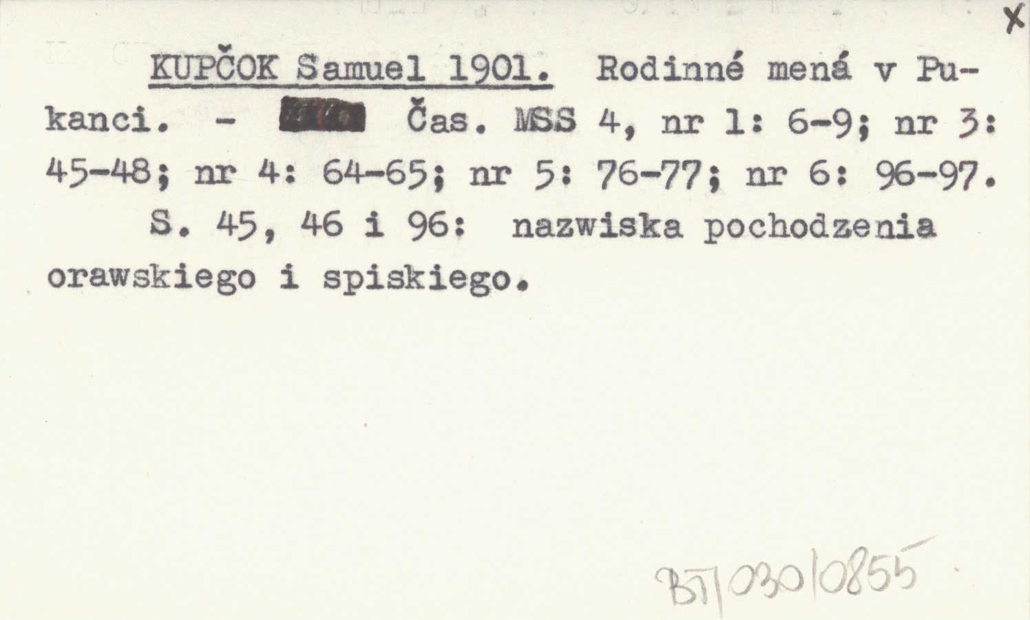 Časopis Muzeálnej Slovenskej Spoločnosti, 4, nr 1: 6-9 ; nr 3: 45-48 ; nr 4: 64-65 ; nr 5: 76-77 ; nr 6: 96-97. S. 45, 46 i 96: nazwiska pochodzenia orawskiego i spiskiego.