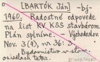 -bj- [BARTÓK Ján] 1960 Radostné odpovede na list KV KSS stavbárom. Plán splníme.