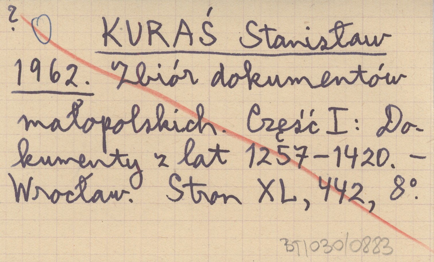 KURAŚ Stanisław 1962 Zbiór dokumentów małopolskich. Cz. I: Dokumenty z lat 1257-1420.