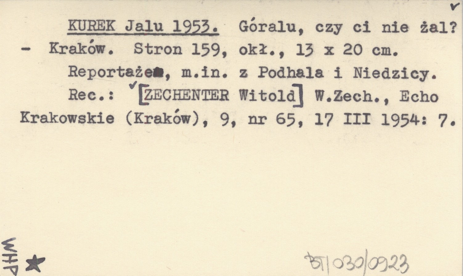 Kraków , 159 s., okł., 13x20 cm. Reportaże, m. in. z Podhala i Niedzicy. REC: [ZECHENTER Witold] W. Zech., Echo Krakowskie (Kraków), 9, nr 65 (17 III 1954): 7.
