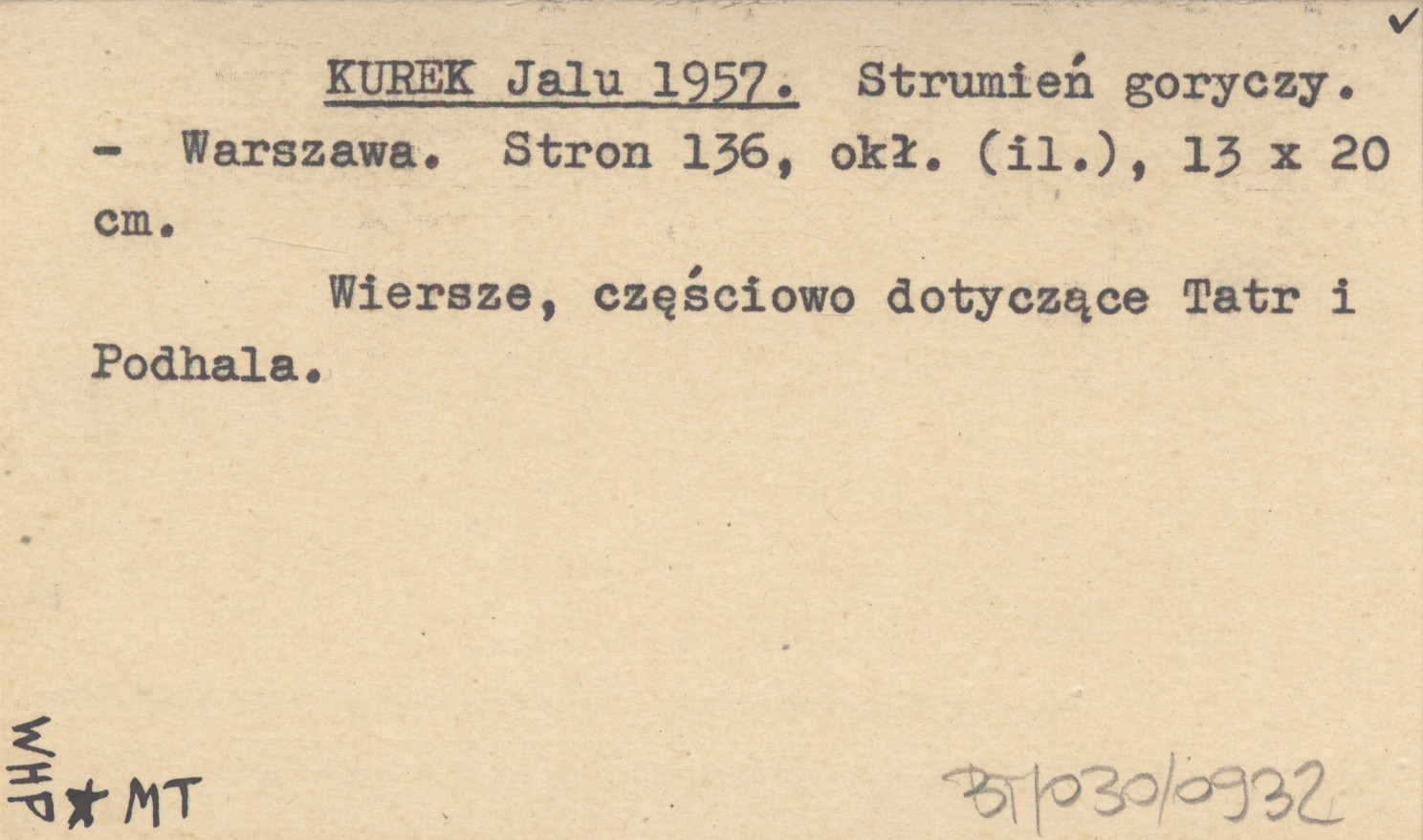 Warszawa , 136 s., okł. (il.), 13x20 cm. Wiersze, częściowo dotyczące Tatr i Podhala.
