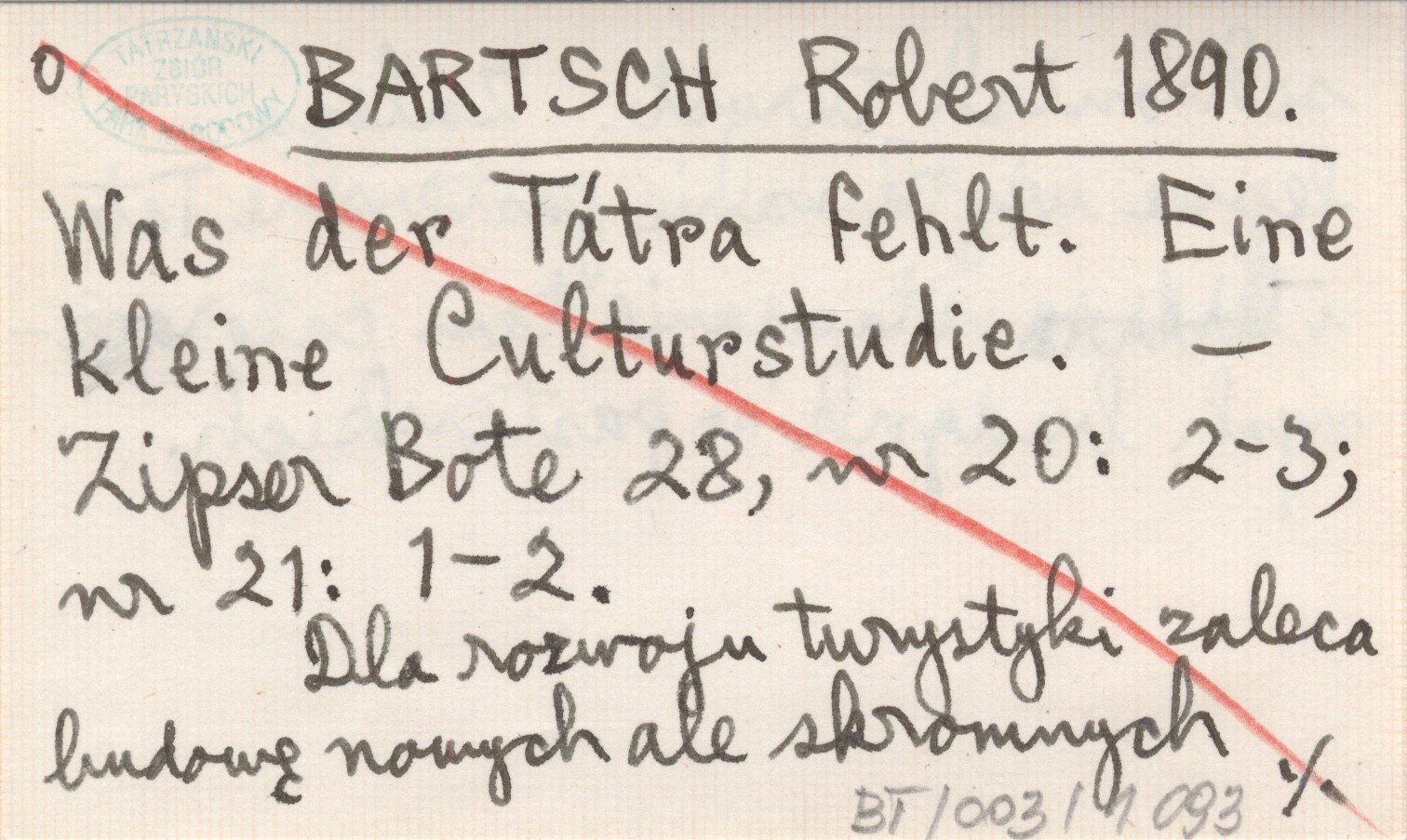 Zipser Bote, 28, nr 20: 2-3 ; nr 21: 1-2. Dla rozwoju turystyki zaleca budowę nowych ale skromnych schronisk turyst. Zaleca lepsze użytkowanie pasterskie Tatr i stawianie tam całorocznych budynków pasterskich.