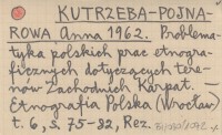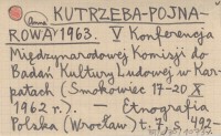 KUTRZEBA-POJNAROWA Anna 1963 V konferencja Międzynarodowej Komisji do Badań Kultury Ludowej w Karpatach (Smokowiec 17-20 X 1962 r.).