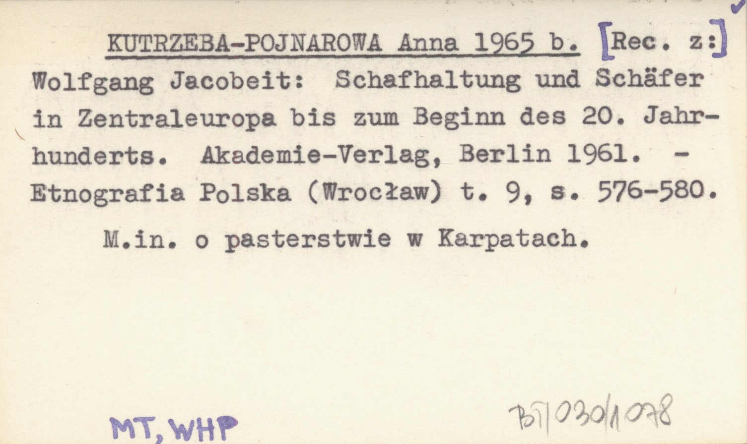 KUTRZEBA-POJNAROWA Anna 1965 b [Rec. z:] Wolfgang Jacobeit: Schafhaltung und Schäfer in Zentraleuropa bis zum Beginn des 20. Jahrhunderts. Akademie-Verlag, Berlin 1961.